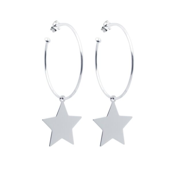 Kolczyki koła wykonane ze srebra próby 925, dodatkowo uszlachetnione rodem. Średnica kolczyków: 32 mm. Wielkość zawieszek gwiazdek: 25×20 mm.