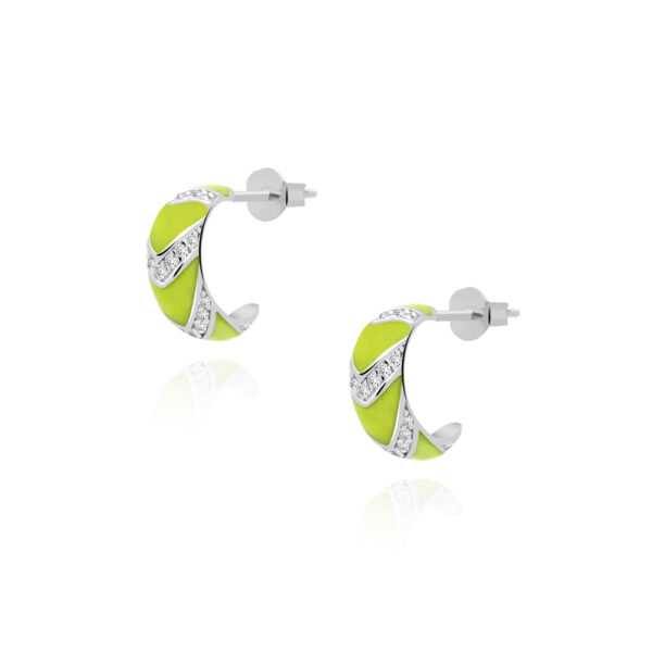 Kolczyki koła srebrne zielone z cyrkoniami. Biżuteria wykonana z najwyższej próby srebra 925 – bez dodatku niklu, nie uczula. Kolczyki pokryte 3 warstwami szlachetnego rodu. Średnica koła: 13 mm. Zapinane na sztyft. Biżuteria modowa ozdobiona zieloną emalią jubilerską oraz cyrkoniami o przejrzystości: AAAAA+, klasa pierwsza. Wysokiej klasy cyrkonia nadaje delikatny błyszczący efekt. Wyrób jubilerski wykonany z ogromną precyzją przez mistrzów jubilerstwa.
