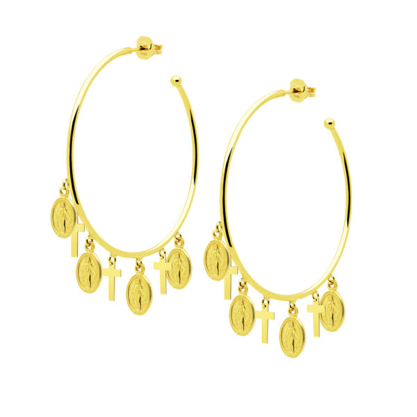 Kolczyki koła wykonane ze srebra próby 925, uszlachetnione 2 mikronami 24 karatowego złota. Kolczyki zapinane na sztyft. Średnica kolczyków: 5 cm. Kolczyki ozdobione zawieszkami: krzyżykami, medalikami.