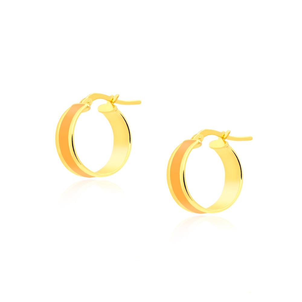 Kolczyki koła z pomarańczową emalią srebrne pozłacane to nowoczesna biżuteria wykonana ze srebra próby 925 pokrytego 24-karatowym złotem. Obręcz o płaskim profilu została ozdobiona frezowanym kanałem wypełnionym intensywnie pomarańczową emalią jubilerską. Precyzyjna konstrukcja oraz zamknięte zapięcie zapewniają komfort noszenia i elegancki charakter biżuterii.