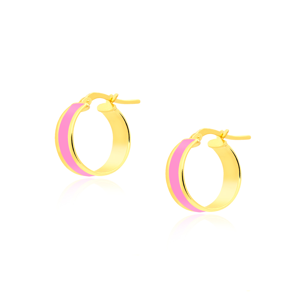Kolczyki koła z różową emalią srebrne pozłacane to nowoczesna biżuteria wykonana ze srebra próby 925 pokrytego 24-karatowym złotem. Obręcz o szerokości 4 mm została ozdobiona frezowanym kanałem wypełnionym intensywnie różową emalią jubilerską. Minimalistyczna forma, perfekcyjny połysk metalu oraz stabilne zapięcie zamknięte tworzą elegancką, ponadczasową kompozycję.