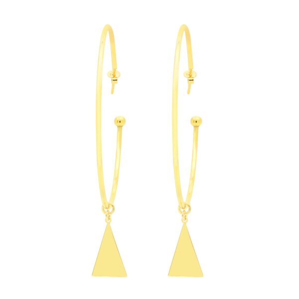 Kolczyki wykonane ze srebra próby 925, dodatkowo pokryte warstwą 18 karatowego złota. Kolczyki koła z zawieszką w kształcie trójkąta. Wielkość zawieszki: 20×14 mm. Średnica kolczyka: 65 mm.