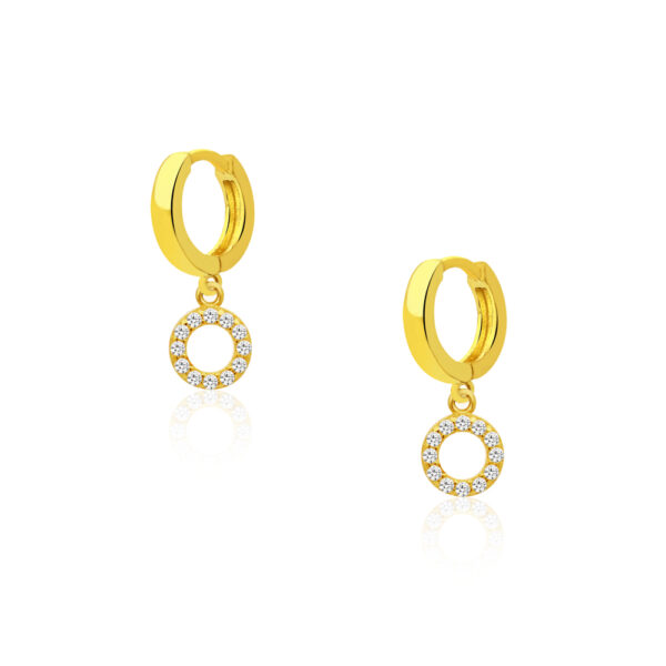 Kolczyki kółeczka z okrągłą zawieszką srebrne pozłacane wykonane z najwyższej próby srebra 925 – bez niklu, nie uczulają. Biżuteria dodatkowo pokryta 3 warstwami 24 karatowego złota. Średnica kółek: 12mm, wysokość kolczyków: 12mm. Kolczyki kółeczka zapinane za zatrzask, ozdobione cyrkoniami o szlifie diamentowym, o przejrzystości: AAAAA+, klasa pierwsza. Wysokiej klasy cyrkonie nadają elegancki błyszczący efekt. Wyrób jubilerski wykonany z ogromną precyzją przez mistrzów jubilerstwa.