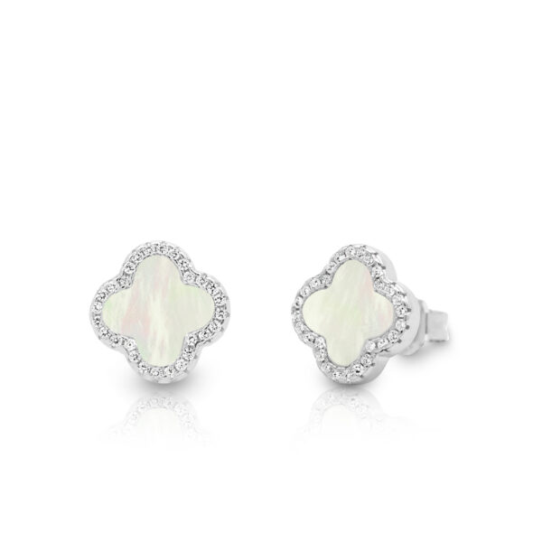 Kolczyki ze srebra o wyjątkowym designie, wzbudzają zachwyt swoją elegancją i finezją. Ich wyjątkową cechą jest koniczynka z masy perłowej otoczona cyrkoniami.