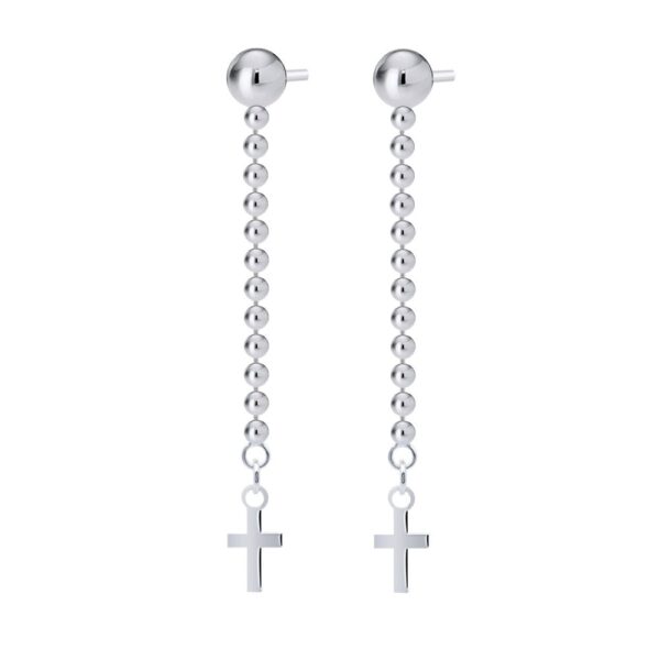 Wiszące kolczyki z kulek z krzyżykiem na końcu, wykonane ze srebra próby 925. Długość kolczyków: 60 mm. Wielkość krzyżyka: 7 x 11 mm.