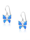 Kolczyki motyle z niebieskim opalem srebrne wykonane z najwyższej próby srebra 925 – bez dodatku niklu, nie uczulają. Biżuteria dodatkowo uszlachetniona 3 warstwami rodu. Kolczyki wiszące o długości 20mm ozdobione naturalnym niebieskim opalem. Wyrób jubilerski wykonany z ogromną precyzją przez mistrzów jubilerstwa.