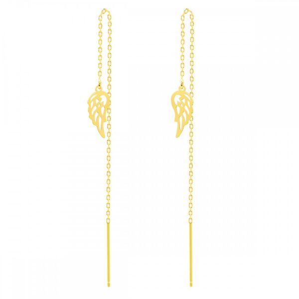 Kolczyki przeciągane srebrne pozłacane skrzydła. Kolczyki wykonane z najwyższej próby srebra 925 – bez dodatku niklu, nie uczulają. Biżuteria pokryta 3 warstwami 24 karatowego złota. Długość łańcuszka: 11,5 cm. Zawieszka anielskie ażurowe skrzydło o strukturze gładkiej, polerowanej i błyszczącej o wymiarach: 15×8 mm. Kolczyki z łańcuszkiem typu ankier, przeciągane. Splot ankier jest jednym z najmocniejszych splotów, odpornym na zerwanie oraz uszkodzenia. Wyrób jubilerski wysokiej jakości wykonany przez mistrzów jubilerstwa z dużą precyzją i dbałością o detale.