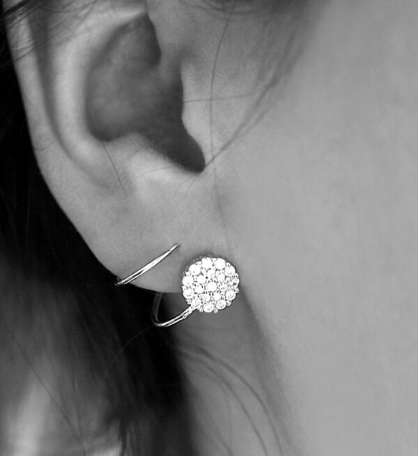 Kolczyki spirale, wykonane ze srebra próby 925, dodatkowo uszlachetnione warstwą rodu. Wielkość części ozdobnej 8×8 mm. Kolczyki przekładane przez dziurkę od tyłu oraz okręcane wokół ucha. Cena dotyczy pary.