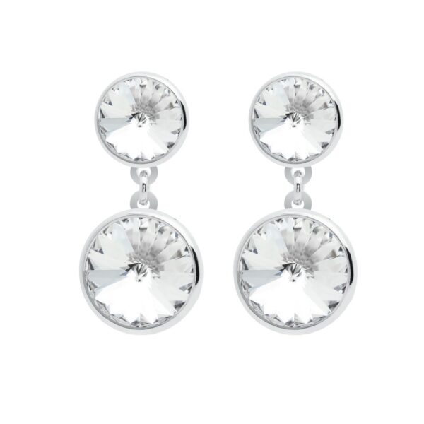 Kolczyki wykonane ze srebra próby 925, dodatkowo uszlachetnione warstwą rodu. Kolczyki ozdobione kryształem Swarovskiego. Średnica kryształów: 7-10 mm. Długość kolczyków 22 mm. Kolczyki zapinane na wkręt.