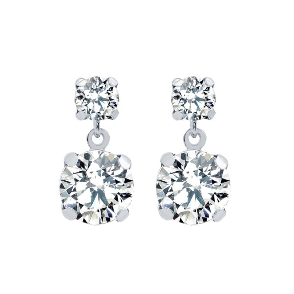 Kolczyki wykonane ze srebra próby 925, dodatkowo uszlachetnione rodem. Kolczyki ozdobione kryształem Swarovskiego. Średnica kryształów: 4-9 mm. Długość kolczyków 2 cm. Zapięcie na sztyft.