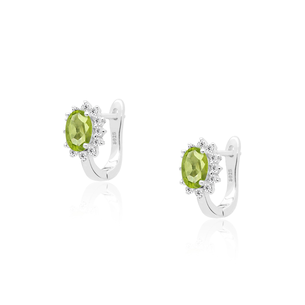 Kolczyki srebrne ozdobione oliwinem w eleganckiej oprawie wykonane z najwyższej próby srebra 925 – bez niklu, nie uczula. Kolczyki dodatkowo pokryte 3 warstwami szlachetnego rodu. Długość kolczyków: 14mm. Biżuteria ozdobiona naturalnym oliwinem o szlifie owalnym o wielkości 5x7mm z cyrkoniami. Wyrób jubilerski wysokiej jakości wykonany przez mistrzów jubilerstwa z ogromną precyzją oraz dbałością o detale.