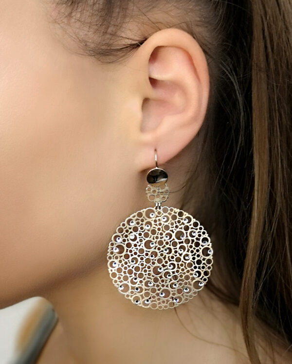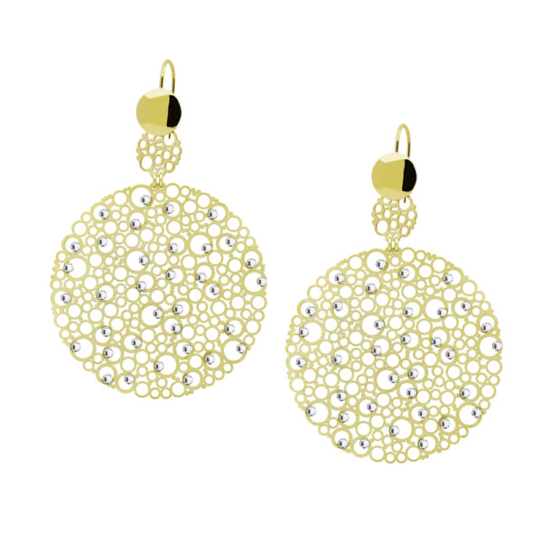 Kolczyki wykonane ze srebra próby 925. Kolczyki uszlachetnione 2 mikronami 24 karatowego złota, ozdobione cyrkonią o brylantowym szlifie. Wymiary: 45×65 mm. Kolczyki te charakteryzuje doskonały design i precyzja. Biżuteria ta to dodatek o niepowtarzalnym charakterze i niespotykanej formie.
