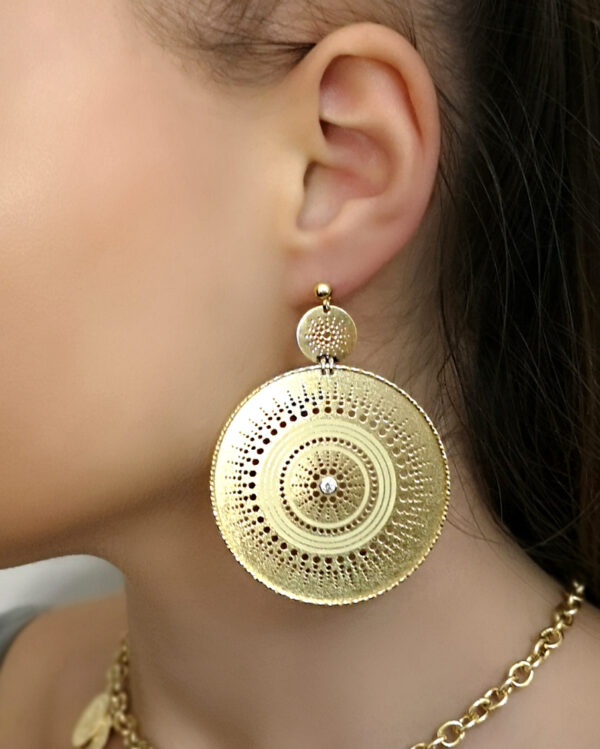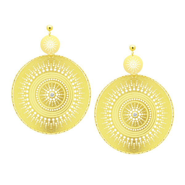 Kolczyki wykonane ze srebra próby 925. Kolczyki uszlachetnione 3 mikronami 24 karatowego złota, ozdobione cyrkonią o brylantowym szlifie. Kolczyki zapinane na sztyft, wymiary: 50×65 mm. Kolczyki te charakteryzuje doskonały design i precyzja. Biżuteria ta to dodatek o niepowtarzalnym charakterze i niespotykanej formie.