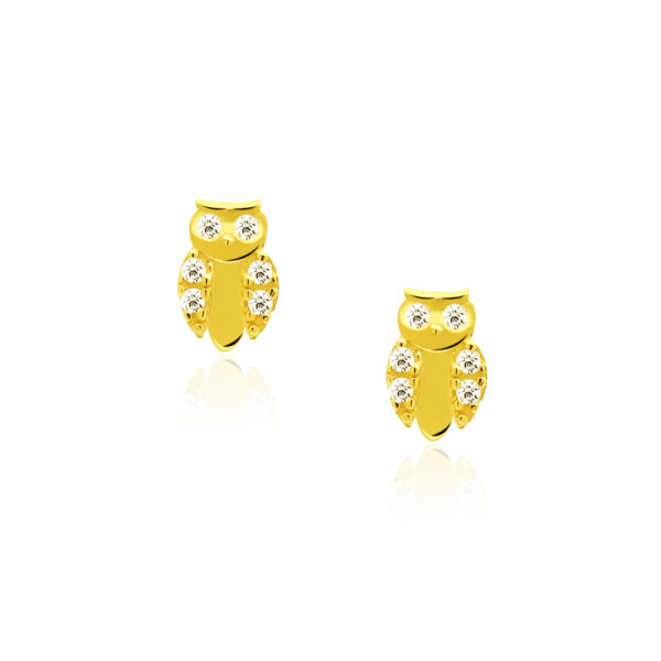 Kolczyki srebrne pozłacane malutkie sówki z cyrkoniami. Biżuteria wykonana z najwyższej próby srebra 925 – bez dodatku niklu, nie uczula. Kolczyki pokryte 3 warstwami 24 karatowego złota. Wysokość kolczyków: 8 mm. Subtelne kolczyki ozdobione białymi cyrkoniami, które przepięknie połyskują pod wieloma kątami.