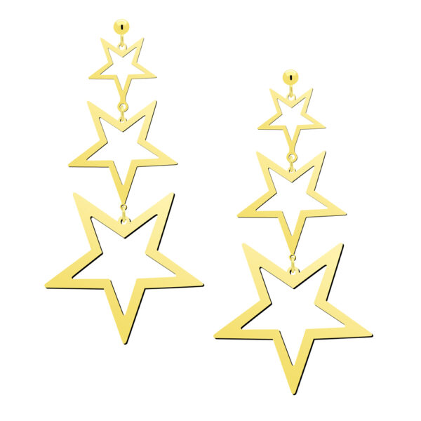 Kolczyki wykonane najwyższej Próby Srebra 925 – bez niklu, nie uczulają. Kolczyki pokryte 3 warstwami 24 karatowego złota. Długość kolczyków wraz zapięciem: 9 cm, Szerokość: 45mm. Długie Wiszące Kolczyki ozdobione Gwiazdkami stanowią niesamowity dodatek każdej stylizacji.