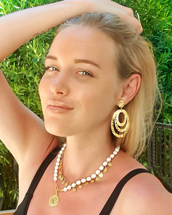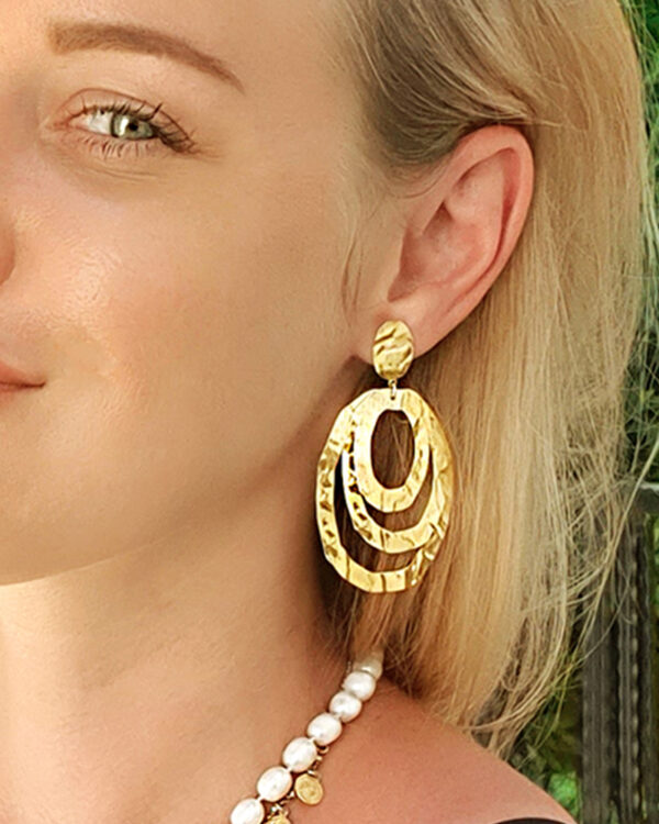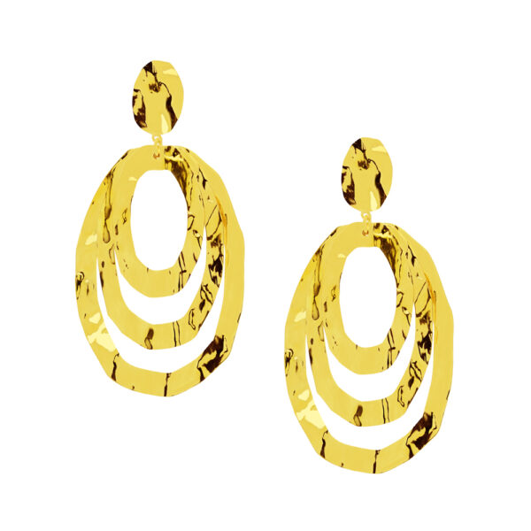 Kolczyki Duże Wiszące Tłoczone 3 Koła wykonane z najwyższej Próby Srebra 925 – bez dodatku niklu, nie uczulają. Kolczyki pokryte 3 warstwami 24 karatowego złota. Długość kolczyków: 68 mm.