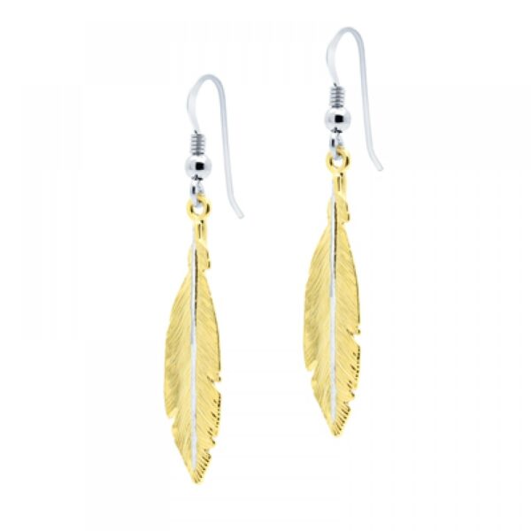 Kolczyki w kształcie piórek, wykonane ze srebra próby 925. Pozłacane złotem najwyższej próby. Wysokość kolczyka 4,8 cm.