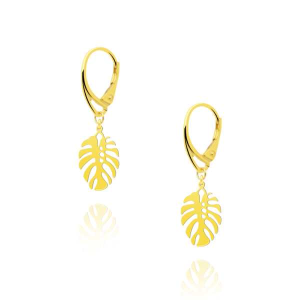 Kolczyki srebrne pozłacane z kwiatkiem monstera. Biżuteria wykonana z najwyższej próby srebra 925 – bez dodatku niklu, nie uczula. Kolczyki pokryte 3 warstwami 24 karatowego złota. Precioza ozdobiona zawieszkami w kształcie kwiatka – monstery o gładkiej, błyszczącej powierzchni, które ślicznie odbiją światło. Wyrób jubilerski wysokiej jakości wykonany przez mistrzów jubilerstwa z ogromną precyzją oraz dbałością o detale.