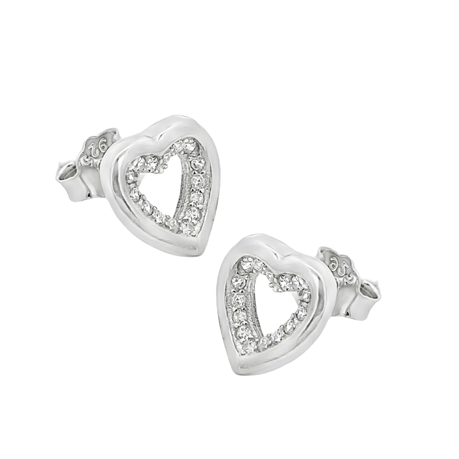 Kolczyki srebrne serce z cyrkoniami w środku wykonane z najwyższej próby srebra 925 – bez niklu, nie uczulają.