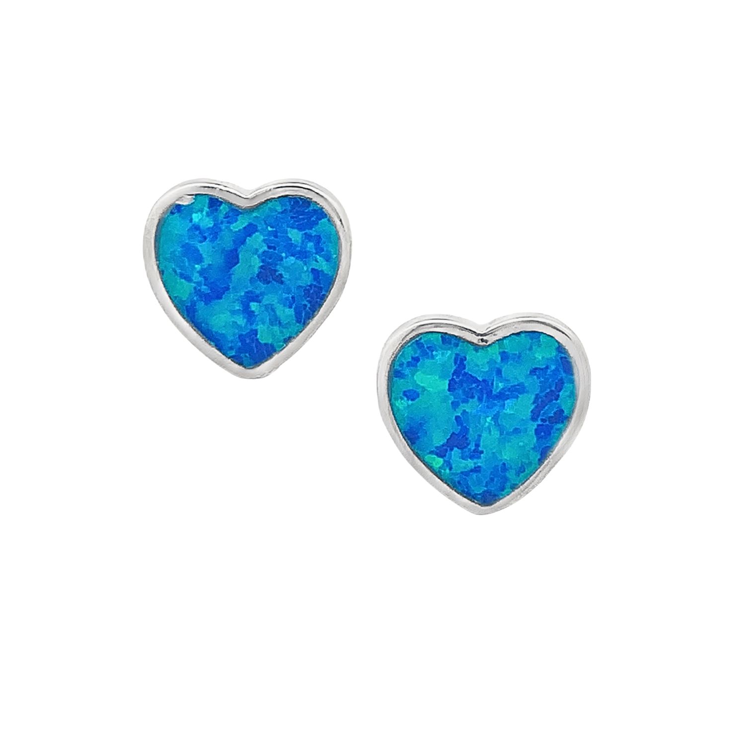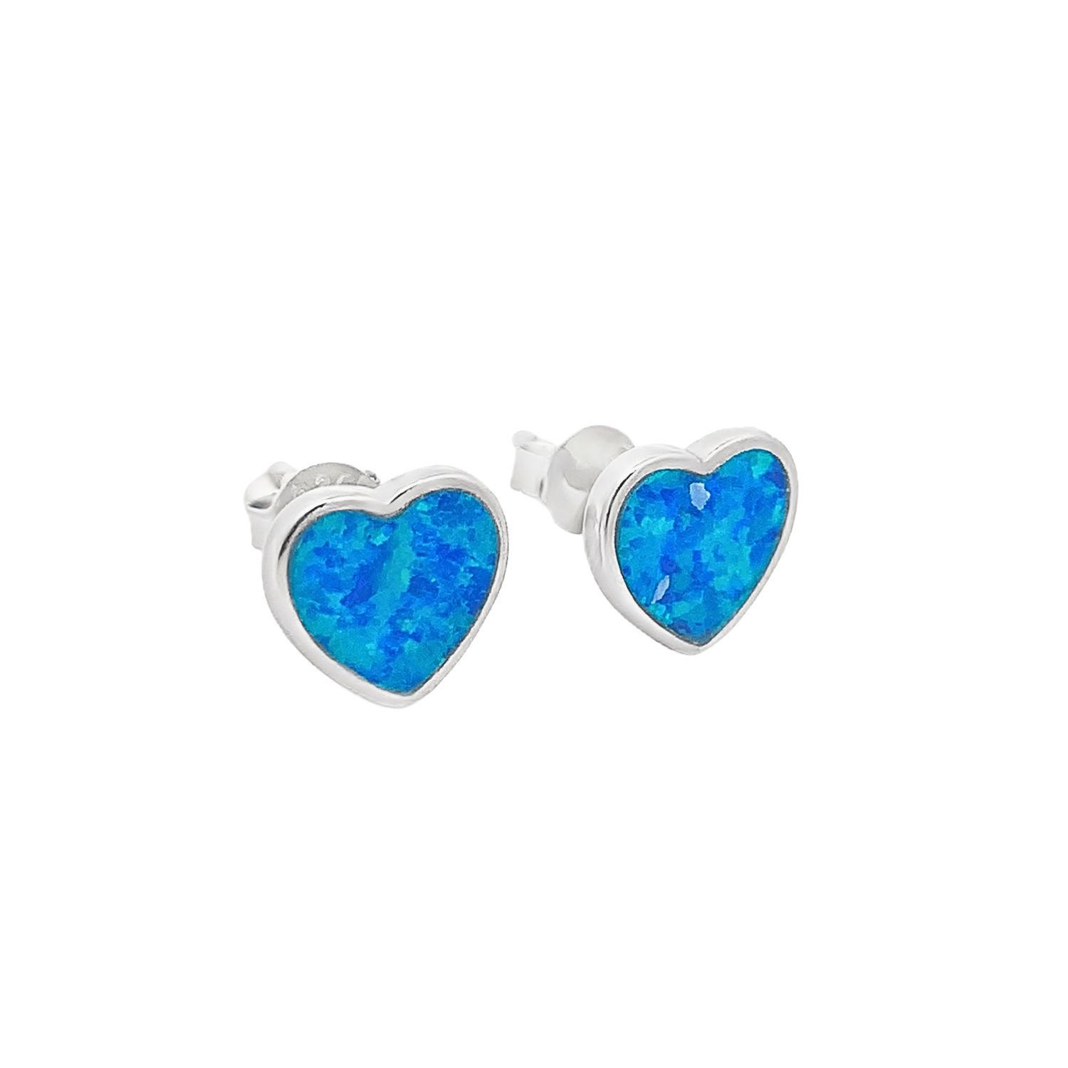 Kolczyki srebrne serduszka niebieski opal wykonane z najwyższej próby srebra 925 – bez niklu, nie uczulają.
