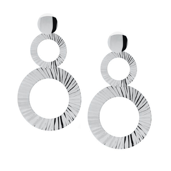 Kolczyki wykonane ze srebra próby 925. Kolczyki uszlachetnione warstwą rodu. Kolczyki zapinane na sztyft, wymiary: 35×60 mm. Kolczyki te charakteryzuje doskonały design i precyzja. Biżuteria ta to dodatek o niepowtarzalnym charakterze i niespotykanej formie.