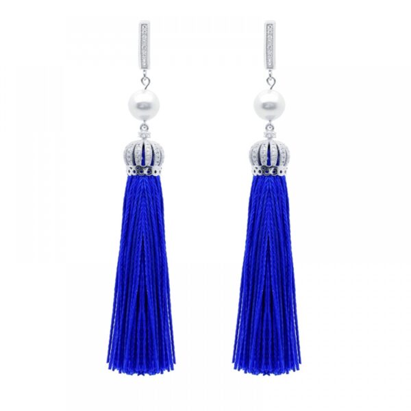 Kolczyki wykonane ze srebra uszlachetnionego rodem próby 925. Kolczyki ozdobione frędzlami w kolorze chabrowym. Górna część kolczyka ozdobiona białą cyrkonią oraz perełką. Typ zapięcia: angielskie. Długość kolczyków: 9 cm.