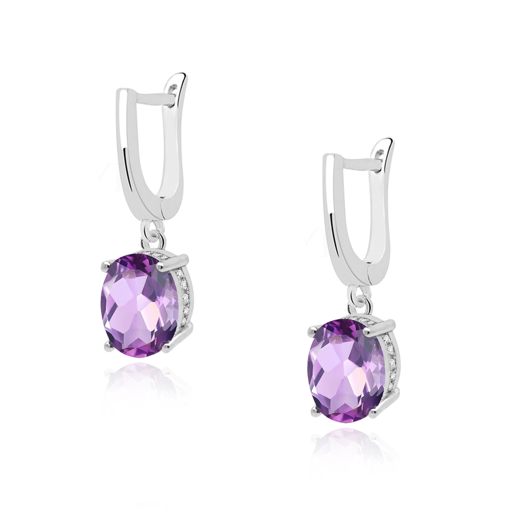 Kolczyki srebrne z ametystem i delikatnymi cyrkoniami wykonane z najwyższej próby srebra 925 – bez niklu, nie uczula. Kolczyki dodatkowo pokryte 3 warstwami szlachetnego rodu. Długość kolczyków: 27mm. Biżuteria ozdobiona naturalnymi ametystami o szlifie owalnym o wielkości 8x10mm oraz cyrkoniami. Wyrób jubilerski wysokiej jakości wykonany przez mistrzów jubilerstwa z ogromną precyzją oraz dbałością o detale.