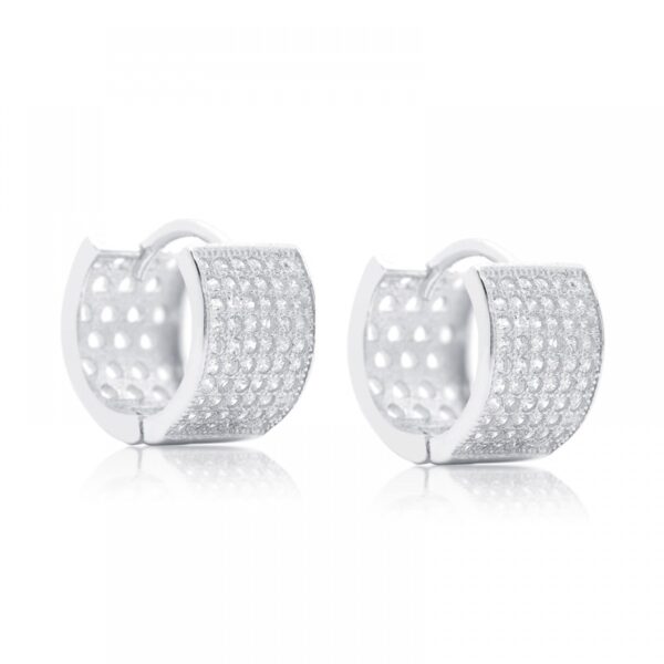 Kolczyki wykonane ze srebra uszlachetnionego rodem próby 925. Typ zapięcia: angielskie. Kolczyki ozdobione białą cyrkonią. Wysokość kolczyków 10 mm. Szerokość kolczyków 7 mm.