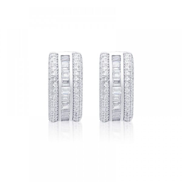 Kolczyki wykonane ze srebra próby 925, dodatkowo uszlachetnione rodem. Wielkość kolczyków: 15x7mm. Kolczyki ozdobione cyrkoniami. Zapięcie angielskie.