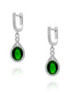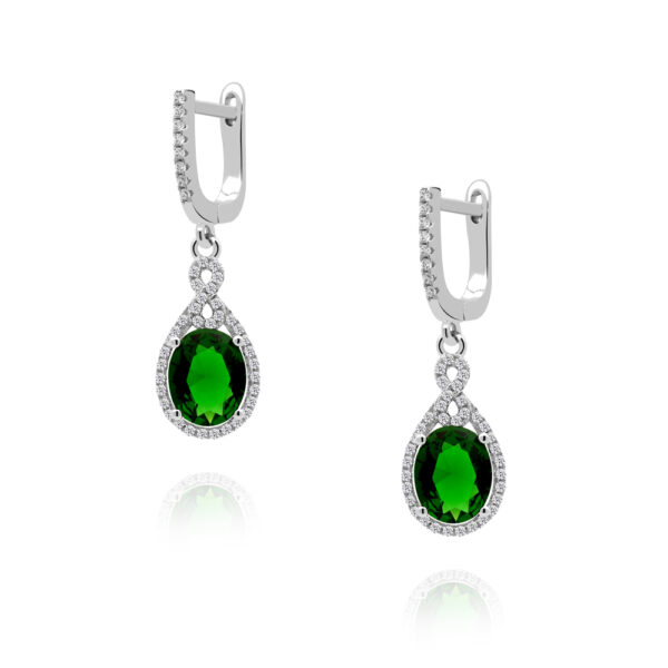Kolczyki srebrne z cyrkonią zieloną wykonane z najwyższej próby srebra 925 – bez dodatku niklu, nie uczula. Biżuteria dodatkowo uszlachetniona 3 warstwami rodu. Wielkość kolczyków: 11x38mm. Kolczyki na zapięciu angielskim ozdobione białymi cyrkoniami o przejrzystość: klasa pierwsza AAAAA+. W centralnym miejscu znajduje się cyrkonia o intensywnie zielonym kolorze o wymiarach: 8×10 mm. Wysokiej klasy cyrkonie nadają delikatny błyszczący efekt. Wyrób jubilerski wysokiej jakości wykonany przez mistrzów jubilerstwa z ogromną precyzją oraz dbałością o detale.