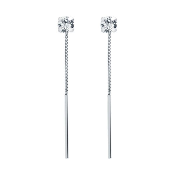Kolczyki wykonane ze srebra próby 925, dodatkowo uszlachetnione warstwą rodu. Kolczyki ozdobione kryształem Swarovskiego. Wielkość kryształu: 5×5. Długość łańcuszka: 4 cm. Kolczyki zapinane na wkręt.