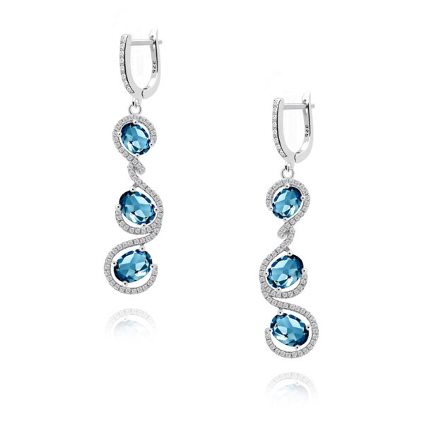Kolczyki srebrne z topazem london blue i cyrkoniami wiszące wykonane z najwyższej próby srebra 925 – bez niklu, nie uczulają. Biżuteria dodatkowo pokryte 3 warstwami szlachetnego rodu. Kolczyki zapinane na zapięcie angielskie. Wielkość kamieni: 5×7 mm oraz 6×8 mm. Kolczyki o długości 54mm mm ozdobione naturalnym szlachetnym topazem london blue o szlifie owalnym oraz cyrkoniami o szlifie brylantowym. Przejrzystość cyrkoni: klasa pierwsza AAAAA+. Wysokiej klasy cyrkonie nadają delikatny błyszczący efekt. Wyrób jubilerski wysokiej jakości wykonany przez mistrzów jubilerstwa z ogromną precyzją oraz dbałością o detale.