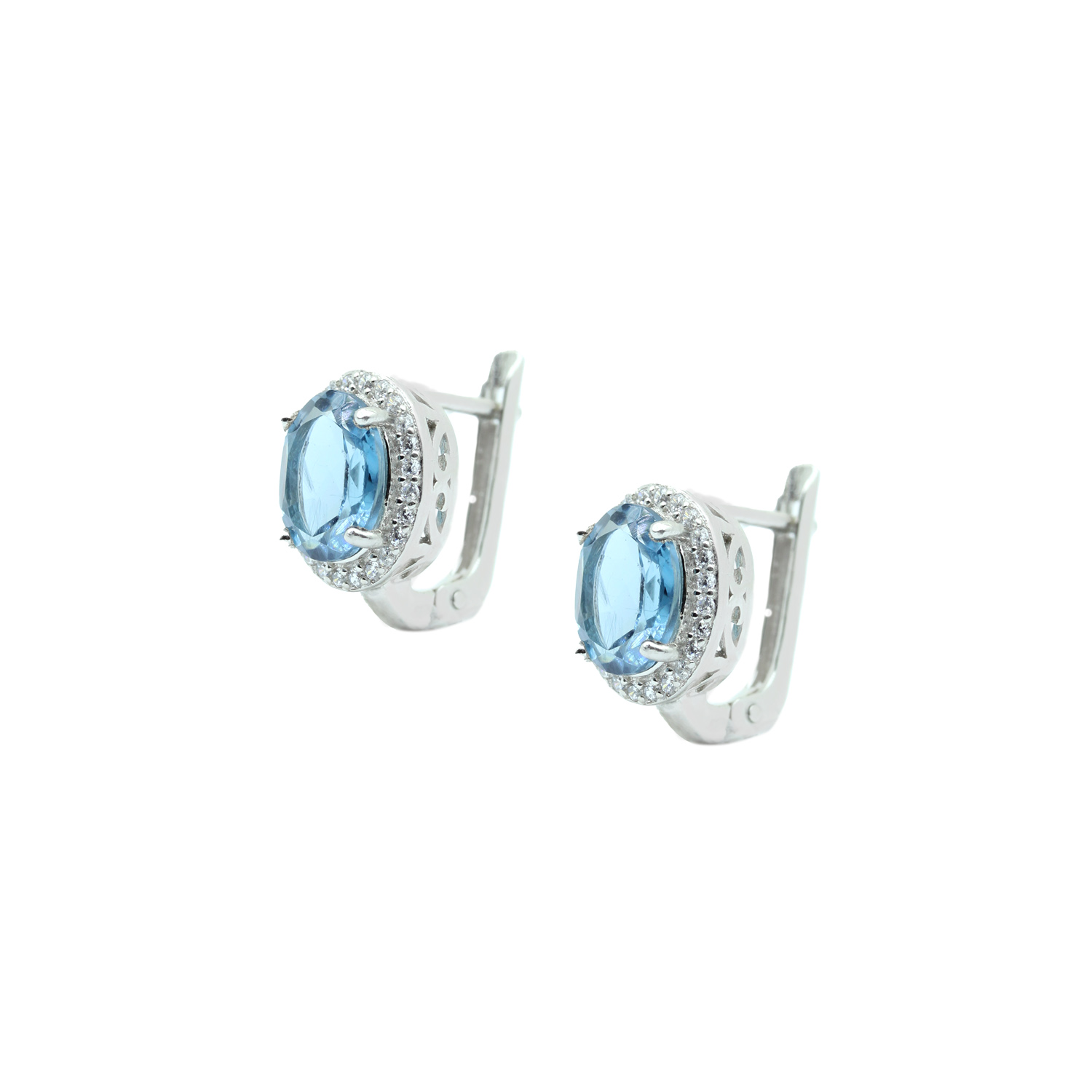 Kolczyki srebrne z topazem to synonim elegancji i subtelnego luksusu. Owalny, jasnoniebieski topaz otoczony halo drobnych, bezbarwnych kamieni olśniewa blaskiem, a wysoki połysk srebra podkreśla precyzję wykonania. Zapięcie angielskie zapewnia komfort i bezpieczeństwo noszenia. Idealne do stylizacji wieczorowych i codziennych.