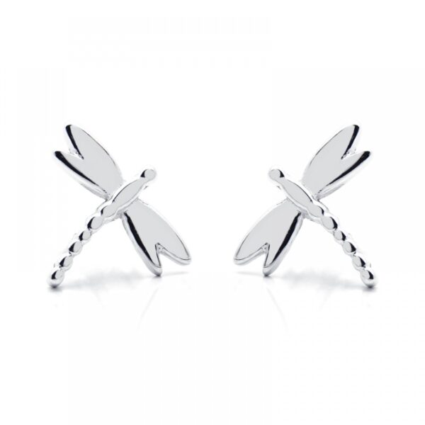 Kolczyki w kształcie ważki wykonane ze srebra uszlachetnionego rodem próby 925. Wysokość kolczyków: 10 mm. Szerokość kolczyków: 10 mm. Zapinanie na sztyft.
