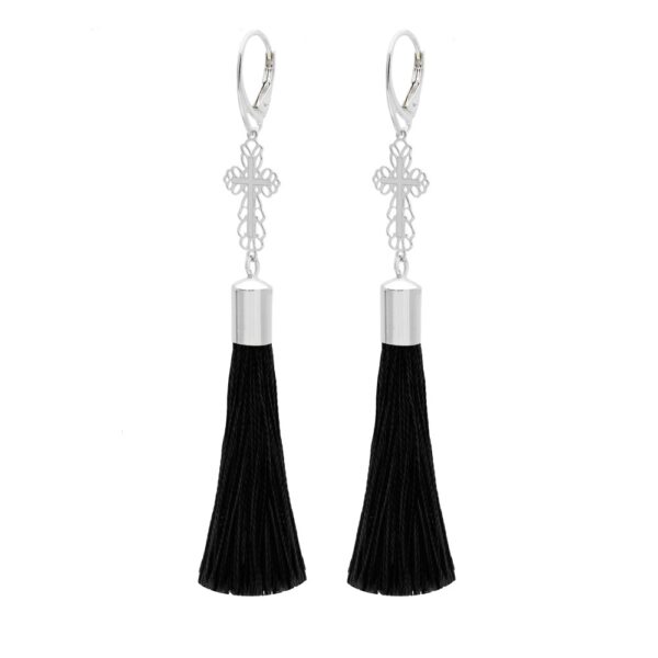 Kolczyki wiszące srebrne krzyże z czarnymi chwostami