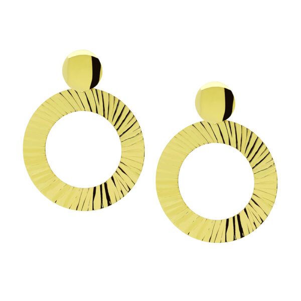 Kolczyki wykonane ze srebra próby 925. Kolczyki uszlachetnione 3 mikronami 24 karatowego złota. Kolczyki zapinane na sztyft, wymiary: 45×55 mm. Kolczyki te charakteryzuje doskonały design i precyzja. Biżuteria ta to dodatek o niepowtarzalnym charakterze i niespotykanej formie.