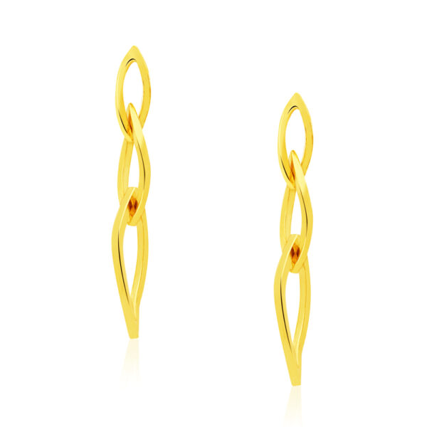 Kolczyki wiszące srebrne pozłacane – sztyft wykonane z najwyższej próby srebra 925 – bez dodatku niklu, nie uczulają. Kolczyki pokryte 3 warstwami 24 karatowego złota. Wysokość kolczyków: 40mm. Zapinane na sztyft. Wyrób jubilerski wykonany z ogromną precyzją przez mistrzów jubilerstwa.