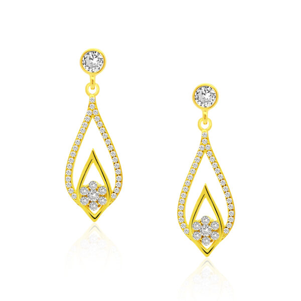 Kolczyki wiszące z cyrkoniami srebrne pozłacane eleganckie wykonane z najwyższej próby srebra 925 – bez niklu, nie uczulają. Biżuteria dodatkowo pokryta 3  warstwami 24 karatowego złota. Wysokość kolczyków: 32mm. Kolczyki zapinane za sztyft. Ozdobione eleganckimi cyrkoniami o szlifie diamentowym, o przejrzystości: AAAAA+, klasa pierwsza. Wysokiej klasy cyrkonie nadają elegancki błyszczący efekt. Wyrób jubilerski wykonany z ogromną precyzją przez mistrzów jubilerstwa.