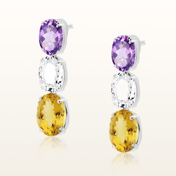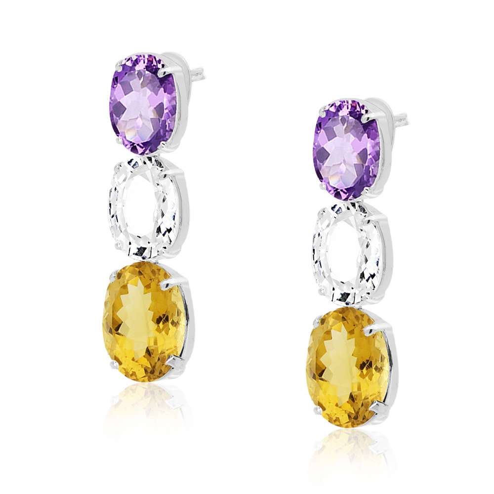 Kolczyki wysadzane ametystem białym topazem oraz cytrynem srebrne wykonane z najwyższej próby srebra 925 – bez niklu, nie uczulają. Biżuteria dodatkowo pokryte 3 warstwami szlachetnego rodu. Kolczyki zapinane sztyft. Długość: 48mm. Bogato ozdobione kamieniami naturalnymi: fioletowym ametystem, białym topazem oraz cytrynem o szlifach owalnych: ametyst: 10x14mm, topaz: 12x17mm, cytryn: 14x18mm.. Wyrób jubilerski wysokiej jakości wykonany przez mistrzów jubilerstwa z ogromną precyzją oraz dbałością o detale.