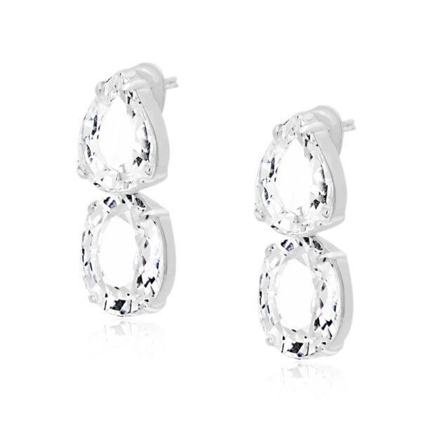 Kolczyki ozdobione białymi topazami o najwyższej klasie kamienia AAA, najwyższej jakości oraz o najwyższym stopniu przeźroczystości. Kamień o najdoskonalszym odcieniu bieli Barwy E. Jakość kamienia jest porównywalna z klasą diamentu o Czystości VVS. Szlify nadane ręcznie w najlepszej manufakturze szlifierskiej kamieni naturalnych na świecie w Jaipur w Indiach. Wykonane przez profesjonalnych szlifierzy specjalizujących się w kunszcie szlifierstwa jubilerskiego. Kamień wydobyty w Birmie, regionie o unikalnych złożach białych topazów na świecie. Birmańskie białe topazy charakteryzują się najwyższą na świecie jakością, przejrzystością, unikalną barwą bieli. Są cenione przez najbardziej prestiżowe domy mody takie jak: Cartier, Tiffany, Bvlgari. Sięgają po nie uznani projektanci światowego jubilerstwa przy tworzeniu unikalnych kolekcji.