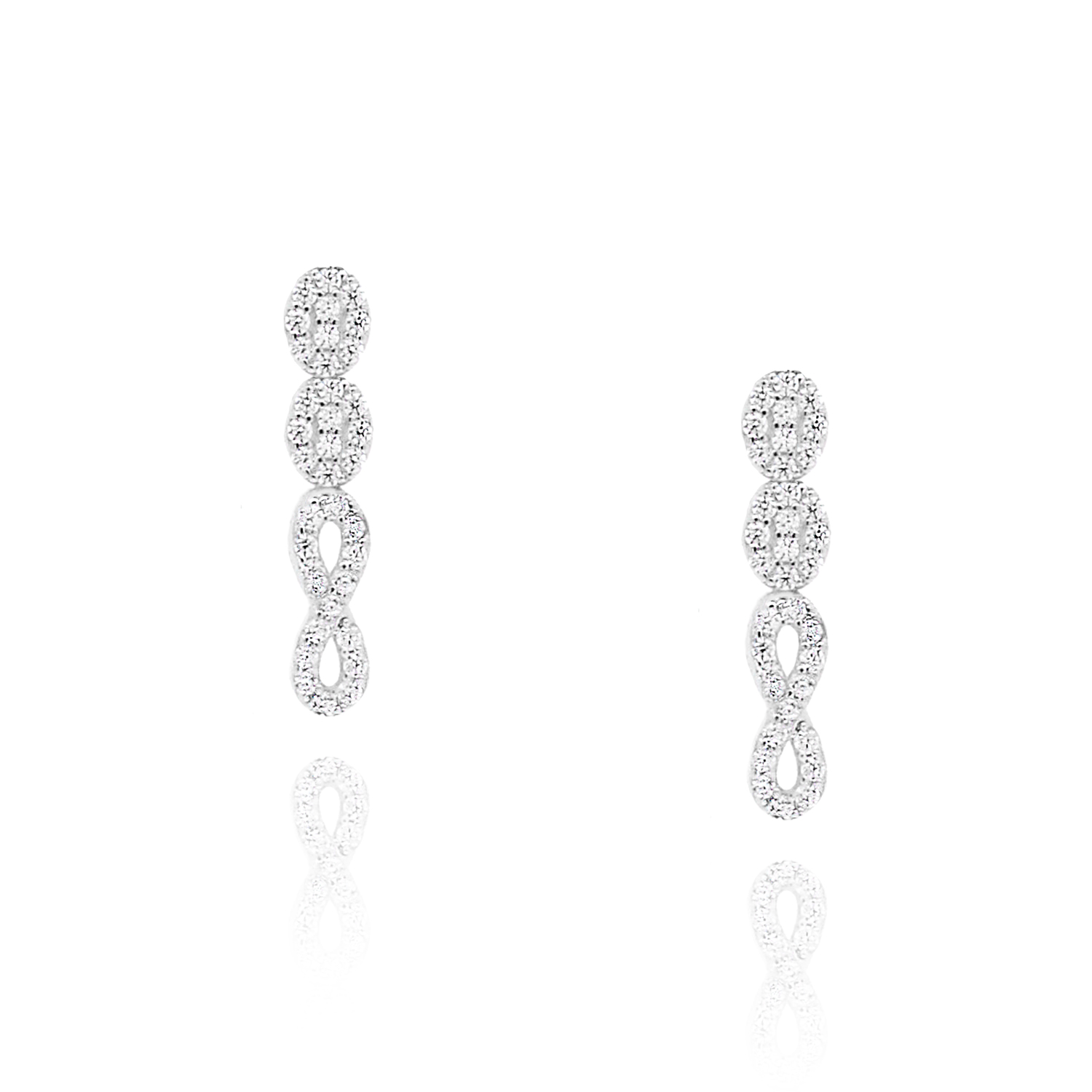 Kolczyki wysadzane cyrkoniami subtelne srebrne wykonane z najwyższej próby srebra 925 – bez niklu, nie uczulają. Biżuteria dodatkowo pokryta 3 warstwami szlachetnego rodu. Wysokość kolczyków: 18mm. Zapinane na sztyft. Ozdobione znakiem nieskończoności oraz cyrkoniami o szlifie brylantowym o przejrzystości: AAAAA+, klasa pierwsza. Wysokiej klasy cyrkonia nadaje delikatny błyszczący efekt. Wyrób jubilerski wysokiej jakości wykonany przez mistrzów jubilerstwa z ogromną precyzją oraz dbałością o detale.