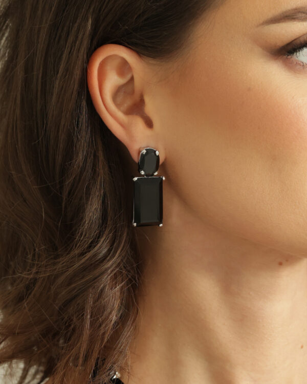 Kolczyki wysadzane onyksami srebrne wykonane z najwyższej próby srebra 925 – bez niklu, nie uczulają. Biżuteria dodatkowo pokryte 3 warstwami szlachetnego rodu. Kolczyki zapinane sztyft. Długość: 39mm. Bogato ozdobione kamieniami naturalnymi onyksami o szlifach: owal o wymiarach: 10x14mm, szmaragdowy: 15x24mm. Wyrób jubilerski wysokiej jakości wykonany przez mistrzów jubilerstwa z ogromną precyzją oraz dbałością o detale.