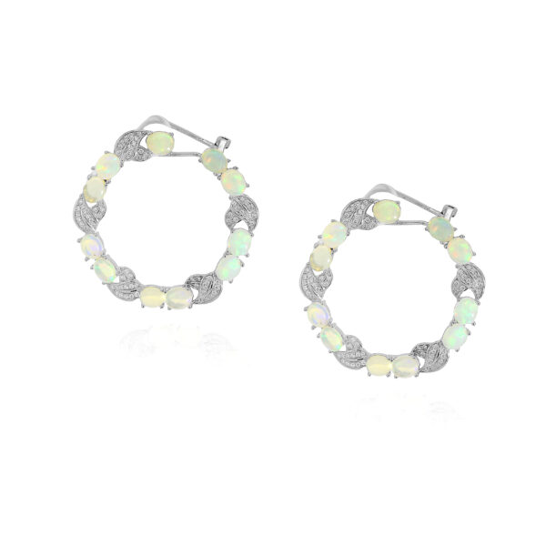 Kolczyki z naturalnym opalem i cyrkoniami srebrne wykonane z najwyższej próby srebra 925 – bez niklu, nie uczulają. Biżuteria dodatkowo pokryta 3 warstwami szlachetnego rodu. Kolczyki zapinane na zapięcie typu zatrzask. Średnica kolczyków: 33 mm. Bogato ozdobione kamieniami naturalnymi opalami o szlifie owal. Wyrób jubilerski wysokiej jakości wykonany przez mistrzów jubilerstwa z ogromną precyzją oraz dbałością o detale.