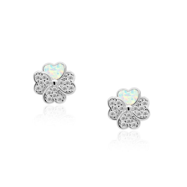 Kolczyki z opalem koniczynki srebrne wykonane z najwyższej próby srebra 925 – bez dodatku niklu, nie uczulają. Biżuteria dodatkowo uszlachetniona 3 warstwami szlachetnego rodu. Kolczyki ozdobione naturalnym białym opalem. Wysokość kolczyków: 7mm. Zapinane na sztyft.
