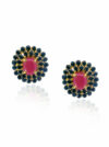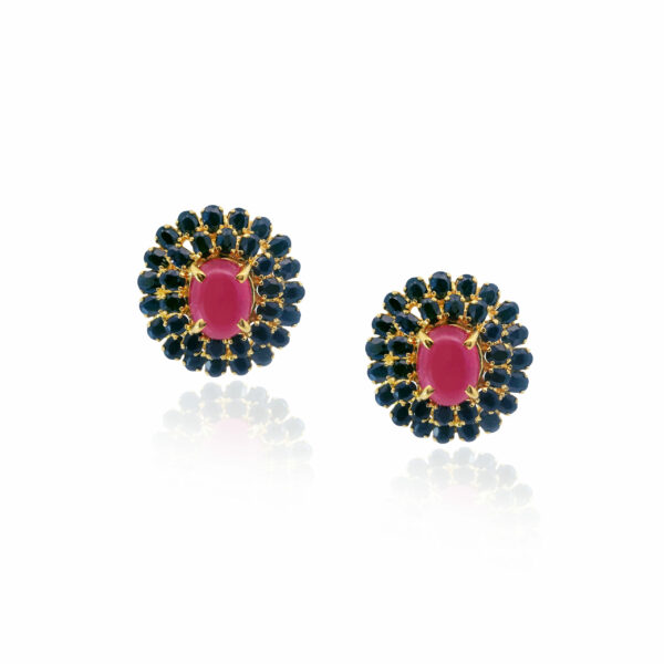 Kolczyki z szafirami i rubinem srebro pozłacane wykonane z najwyższej próby srebra 925 – bez dodatku niklu, nie uczulają. Kolczyki pokryte 3 warstwami 24 karatowego złota. Wielkość kolczyków: 25×25 mm. Wyrób jubilerski wykonany z ogromną precyzją przez mistrzów jubilerstwa.