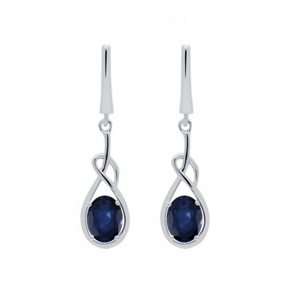 Kolczyki wykonane ze srebra próby 925, dodatkowo uszlachetnione rodem. Kolczyki ozdobione naturalnym kamieniem szlachetnym- Szafirem afrykańskim. Kamień zawiera inkluzje. Wysokość kolczyków 3,7 cm. Wielkość kamieni 8×6 mm. Kolczyki na zapięcie angielskie. Szafir jest odmianą korundu, najtwardszego kamienia po diamencie występującego w naturze. Bardzo trwały, idealny do noszenia na co dzień.