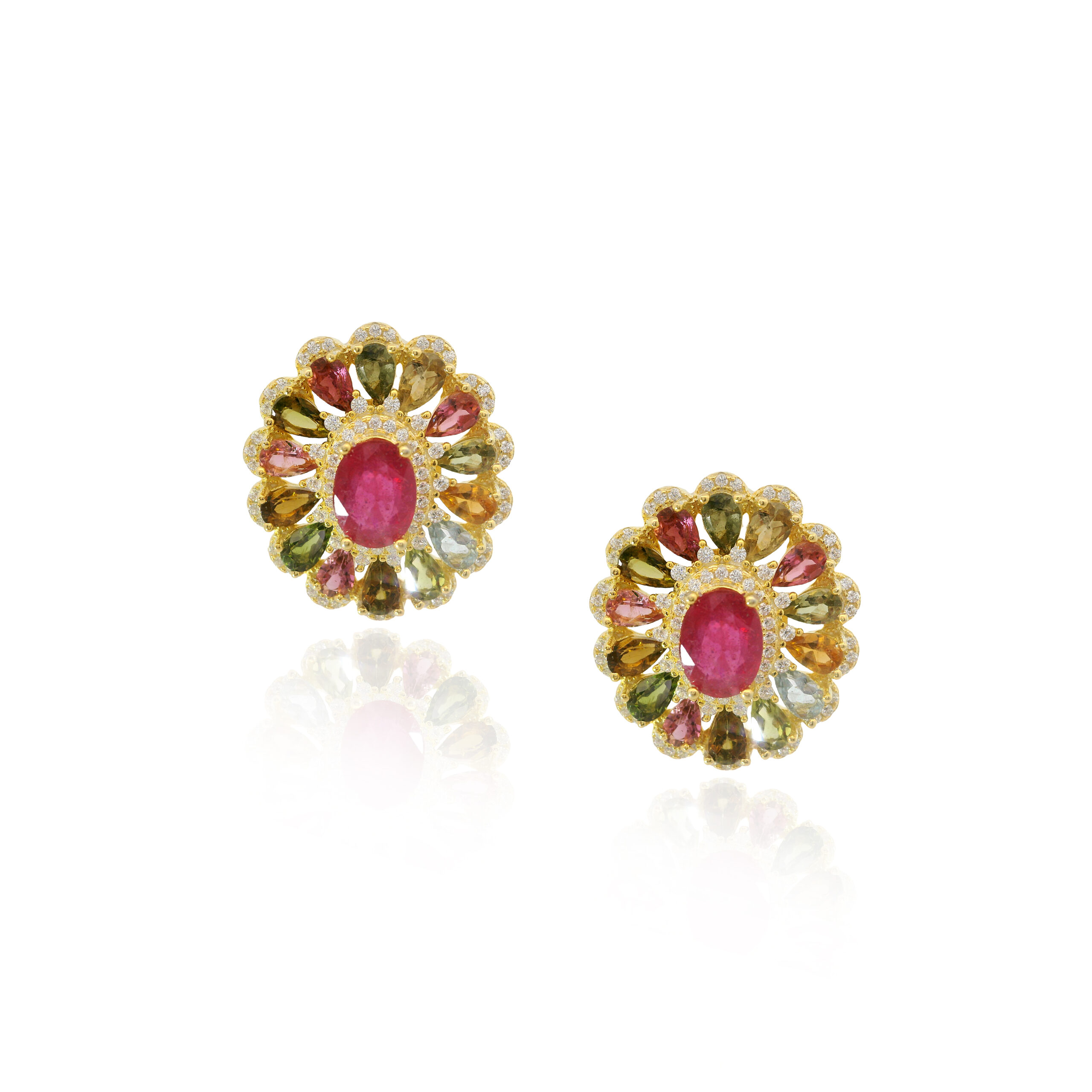 Kolczyki z turmalinami i rubinem srebro pozłacane wykonane z najwyższej próby srebra 925 – bez dodatku niklu, nie uczulają. Kolczyki pokryte 3 warstwami 24 karatowego złota. Wielkość kolczyków: 20×25 mm. Wyrób jubilerski wykonany z ogromną precyzją przez mistrzów jubilerstwa.