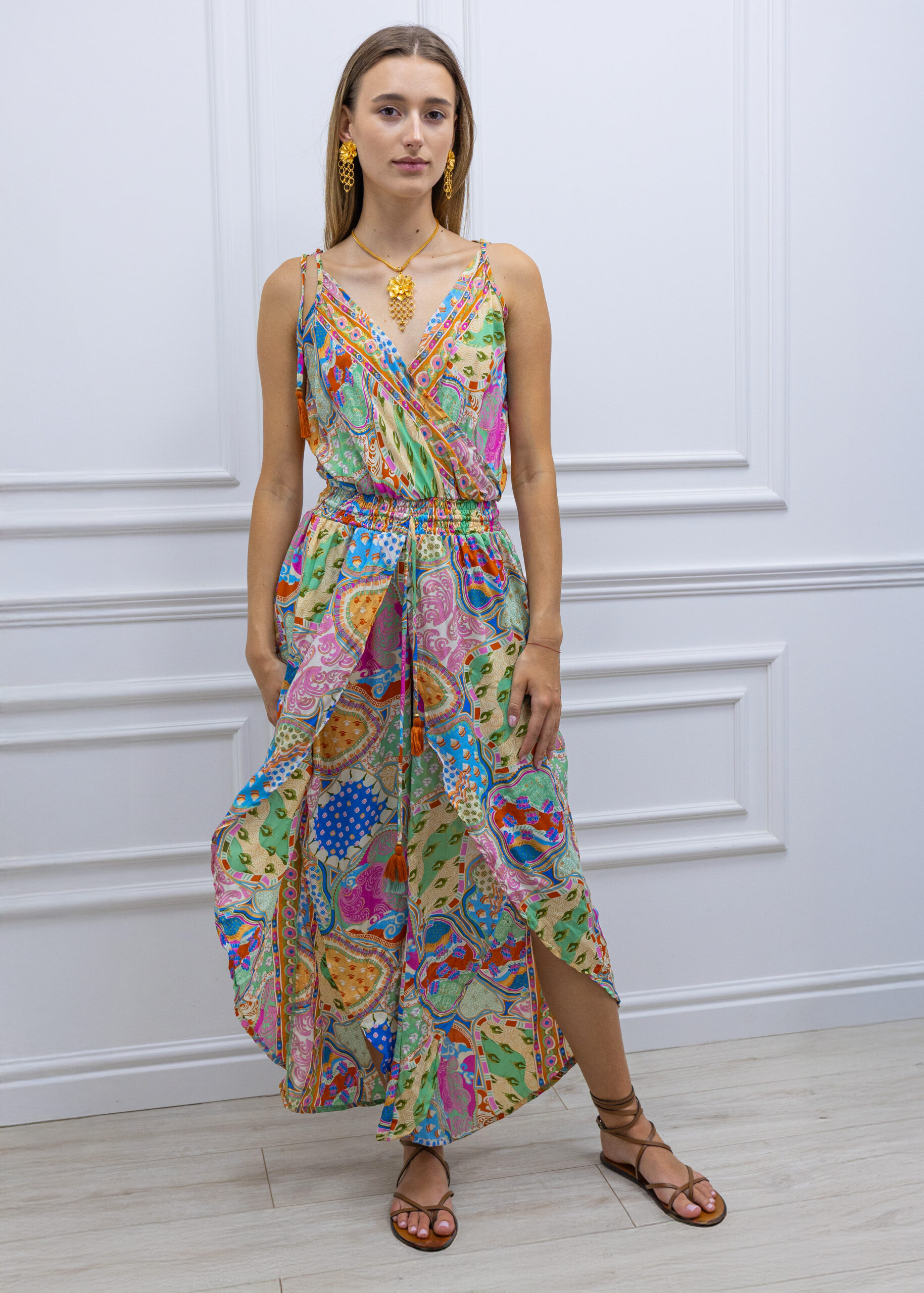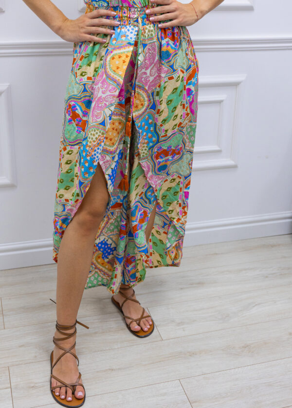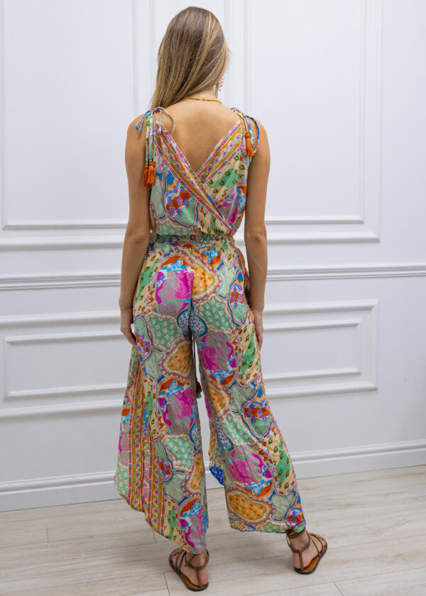 Rozświetl swoją garderobę prawdziwą eksplozją barw! Ten wzorzysty kombinezon handmade został uszyty z najwyższej jakości 100% naturalnego jedwabiu, który nie tylko zachwyca luksusowym połyskiem, ale też zapewnia niezrównany komfort noszenia. Intensywne, jaskrawe kolory i oryginalny print nadają mu energii, a fason ze spodniami 3/4 sprawia, że jest idealny na lato, podróże i stylowe wyjścia w ciągu dnia.