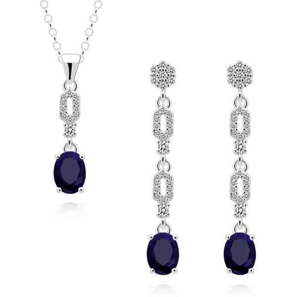 Komplet ozdobiony szafirem oraz cyrkoniami srebrny – kolczyki z zawieszką wykonany z najwyższej próby srebra 925 – bez niklu, nie uczula. Biżuteria dodatkowo pokryty 3 warstwami szlachetnego rodu. Długość kolczyków: 38mm. Długość zawieszki: 27mm. Biżuteria ozdobiona naturalnym szafirem o szlifie owalnym o wielkości 6x8mm oraz cyrkoniami o szlifie brylantowym o przejrzystości: AAAAA+, klasa pierwsza. Wysokiej klasy cyrkonia nadaje delikatny błyszczący efekt. Wyrób jubilerski wysokiej jakości wykonany przez mistrzów jubilerstwa z ogromną precyzją oraz dbałością o detale.
