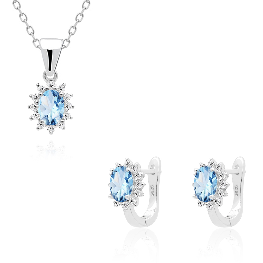 Komplet srebrny ozdobiony niebieskim topazem w eleganckiej oprawie – kolczyki z zawieszką wykonany z najwyższej próby srebra 925 – bez niklu, nie uczula. Biżuteria dodatkowo pokryta 3 warstwami szlachetnego rodu. Długość kolczyków: 14mm. Długość zawieszki: 18mm. Biżuteria ozdobiona naturalnymi niebieskimi topazami o szlifie owalnym o wielkości 5x7mm oraz cyrkoniami. Wyrób jubilerski wysokiej jakości wykonany przez mistrzów jubilerstwa z ogromną precyzją oraz dbałością o detale.